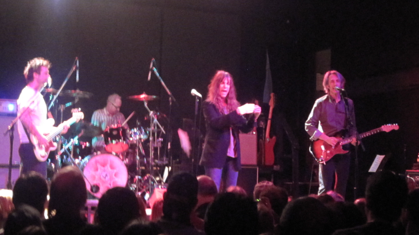Patti’s daughter, Jesse, was the opening act again. But this time, there was some context for her noodling piano, accompanied by mallet percussion from Michael Campbell (who looks very much like a young Glen Campbell): One of their tunes was written for a movie soundtrack. It all made so much more sense because they decided to play it with the film something they forgot to do on the first night. Their playing was a bit more self-assured, but still barely rose above amateurish experimentation. Mom’s longtime guitarist, Lenny Kaye, joined them for a song, raising the level of musicianship exponentially in the process.